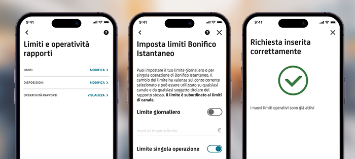 Sui bonifici istantanei è possibile impostare un importo massimo trasferibile sia su base giornaliera che per singola operazione.